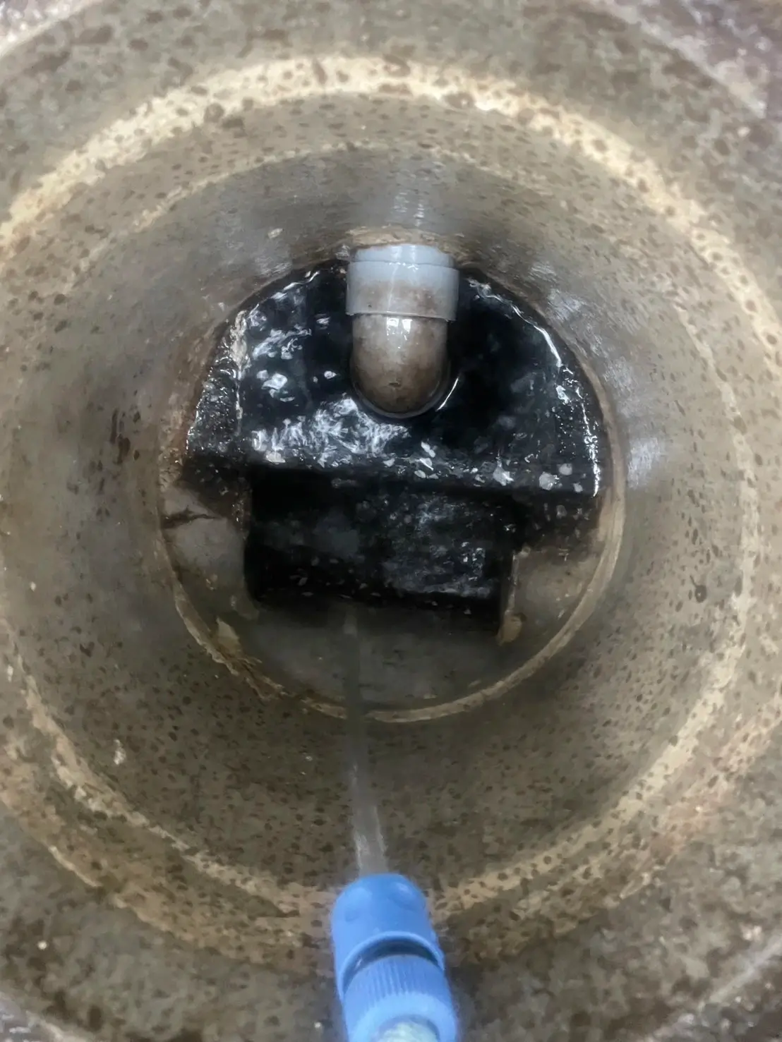 高圧洗浄により内部を洗浄し、固着していた汚れや侵入していた根を除去したことで排水の流れは正常に回復しています。