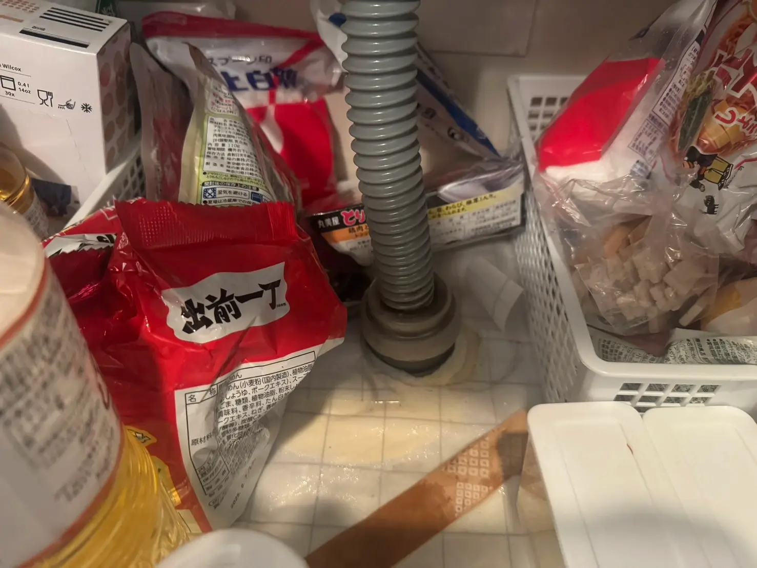 シンク下から水が漏れているのに気づき、慌てて台所の収納を全部出しました。